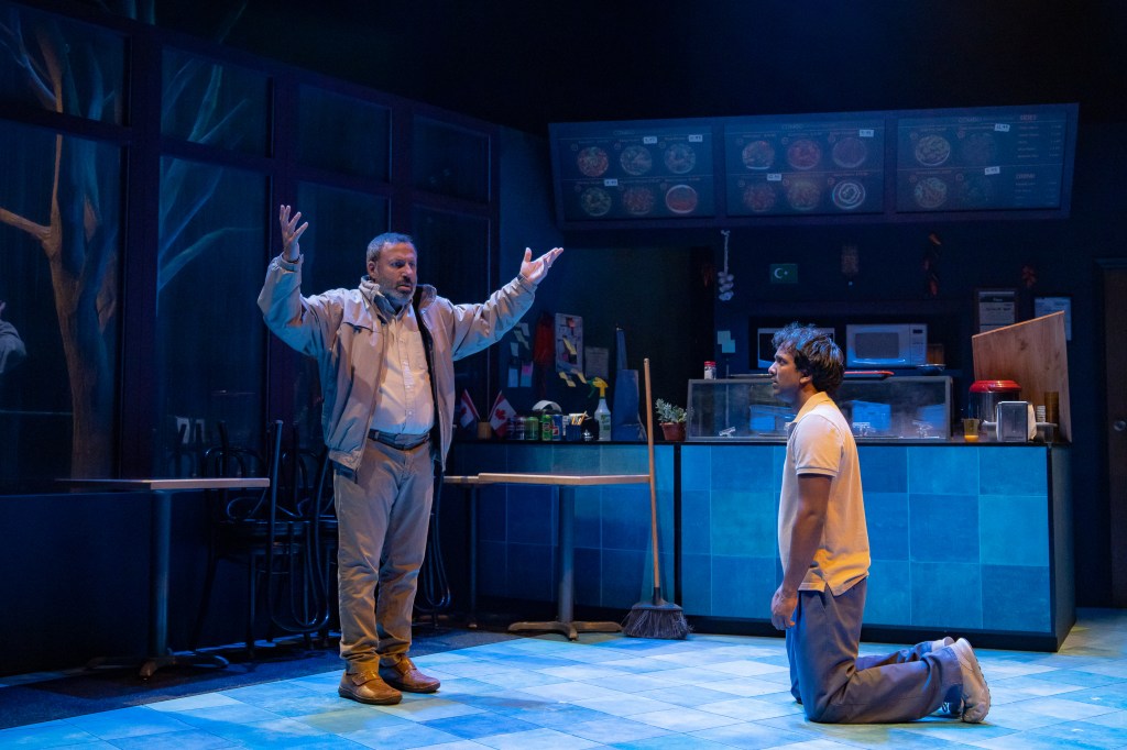 I saw the opening night of the Belfry’s Behind the Moon last night, written by Anosh Irani and directed by Leora Morris. I was quite moved by this play, which received a standing ovation from the audience at the end. Anosh Irani has written a number of plays, and also a novel. I saw his play Buffoon in Vancouver in 2020, and really enjoyed it. This play looks at the immigrant experience in Canada, in which a young man, Ayub (Ben Yoganathan) is separated from his family, wife and daughter, who have remained in India. We find out that his boss Qadir Bhai (Anand Rajaram) has been abusing him, subjecting him to a kind of indentured servitude. He meets up with a taxi driver, Jalal (Rizwan Mani) who comes in late at night after his shift. Ayub gives him two free meals of butter chicken, and in return, Halal returns with the gift of a beautiful carpet made by his wife.