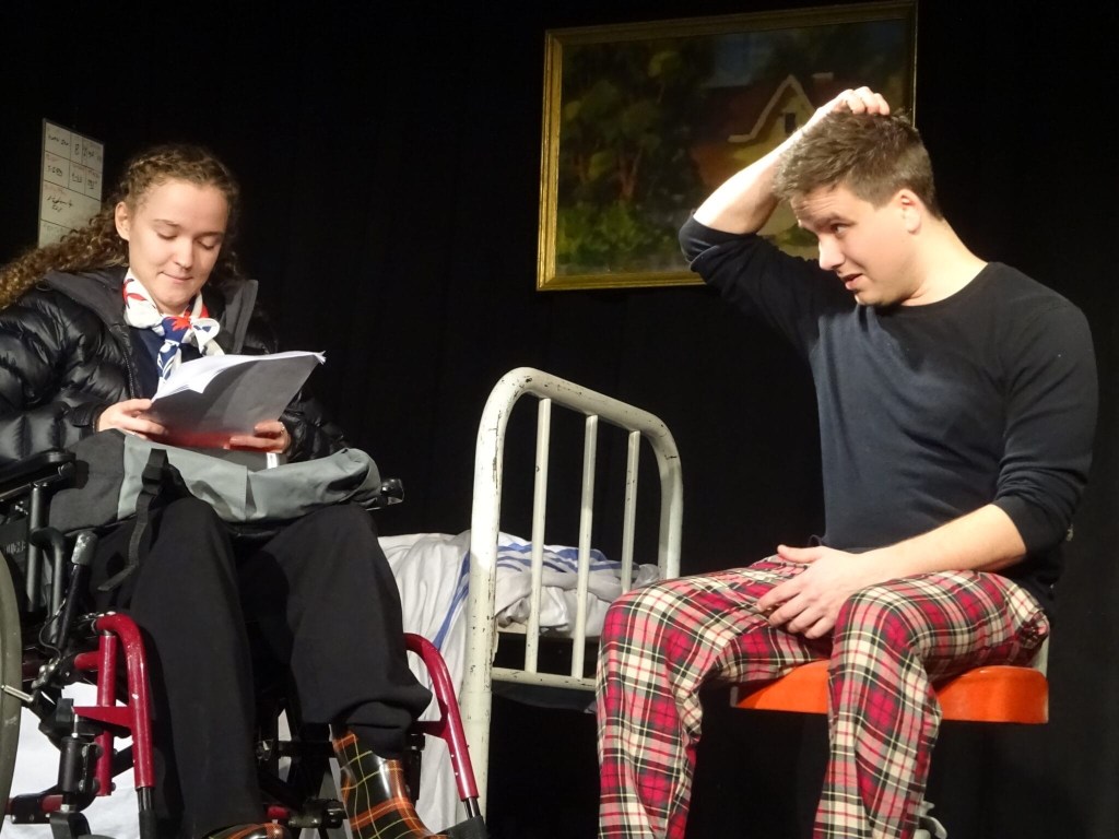 I really enjoyed seeing Armstrong’s War by Colleen Murphy on the final day of the run. This play resonated on a number of levels with me, as it features a man injured in Afghanistan and his ‘reader’, a volunteer who comes to read to him from time to time. The first book Halley (Mariah Madill) gives Michael (Nolan Fidyk in a solid and nuanced performance) is The Red Badge of Courage by Stephen Crane. Michael ends up reading this book three times, each time appreciating it even more. Unfortunately, he damages the book, but Halley understands why. Halley has her own story as well, involving a car accident which paralyzed her and, unfortunately, took her father’s life. I turns out that Michael was injured in Afghanistan and has returned home with some PTSD, especially in regards to a friend, Robbie who was catastrophically injured in the war and is in a nursing home for the rest of his life. The play was well-directed by Morgan Gadd (who directed and designed the set!), who keeps the action moving forward throughout the play. Stage-managed by Andrea Gregg (who also designed the lighting), with Artistic Director Clayton Jevne constructing the set. I found this play quite moving. Now closed.